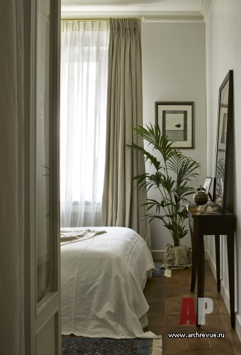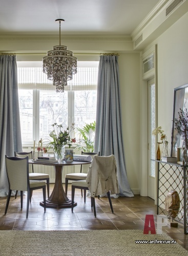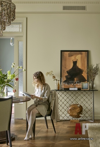 Столовая является структурным центром пространства: четыре витражных двери (две раздвижные и две распашные) ведут из нее в кухню, гардеробную и приватные апартаменты: хозяйскую спальню с ванной комнатой и гардеробной, а также в кабинет. Расположенная на одной оси со столовой гостиная служит ее продолжением, открытый портал с нишами прекрасно пропускает свет и воздух.
