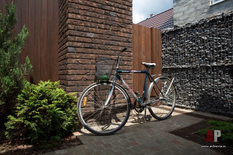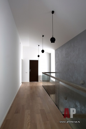 Входная зона с низким потолком спускается к гостиной и кухне-столовой, где потолки уже значительно выше, оттуда перетекает в наполненную воздухом кухню-столовую с панорамным остеклением и выходом во двор. На верхнем этаже, в помещениях с открытой стропильной системой расположены три спальни, бильярдная, гардеробные и ванная комната. На переходе, соединяющем жилую часть дома со СПА-зоной, организована дополнительная терраса, а на навесе над парковкой - клумба с гравием и каменной дорожкой.