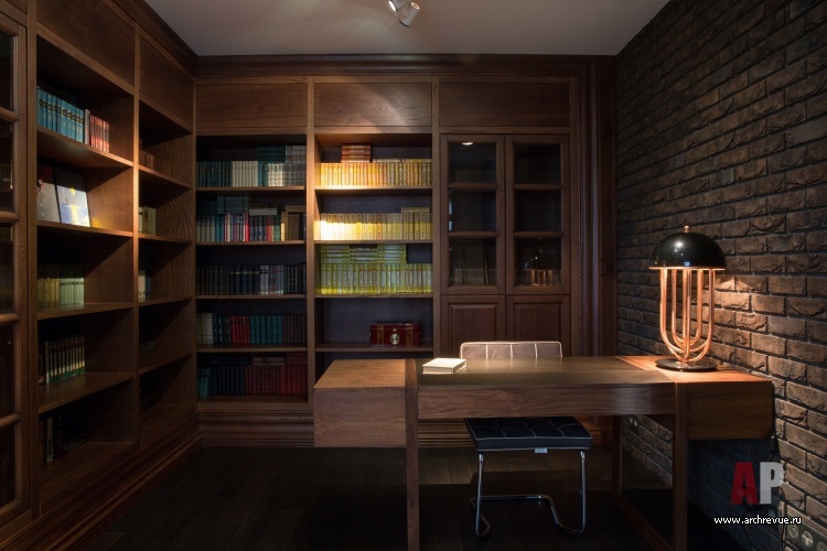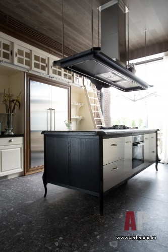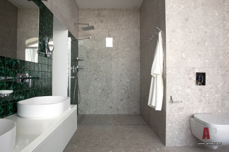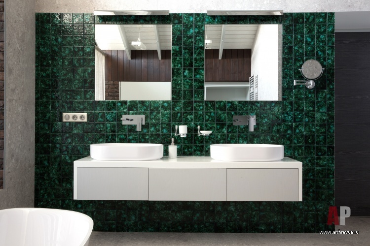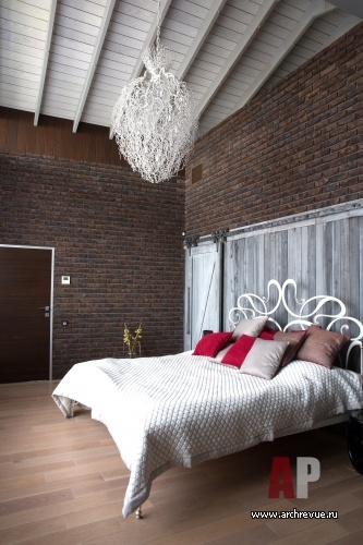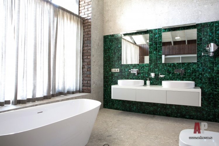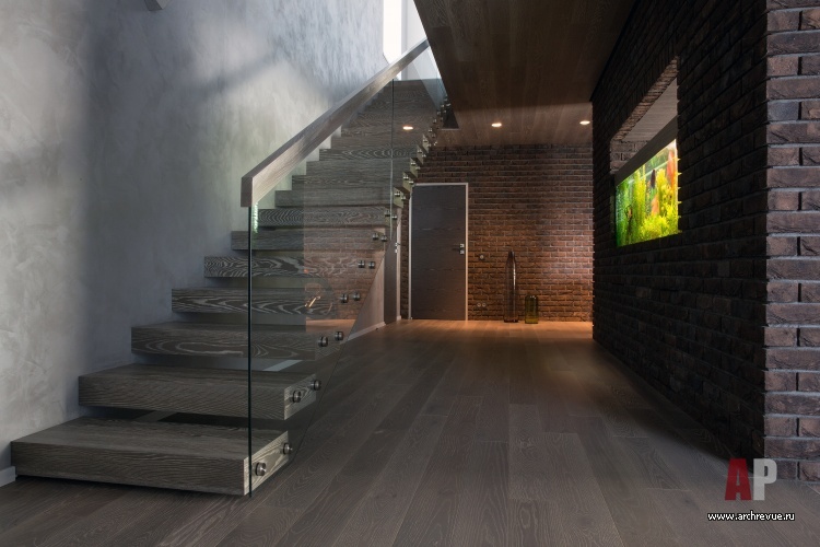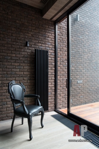 С брутальными стенам сочетается половое покрытие из серого крупноформатного керамогранита (в мокрых зонах) и широкой половой доски (в приватных помещениях). Элементы индустриальной эстетики вызывают ассоциации с американскими лофтами. Мебель в стиле фьюжн и китч и только усиливает это ощущение.