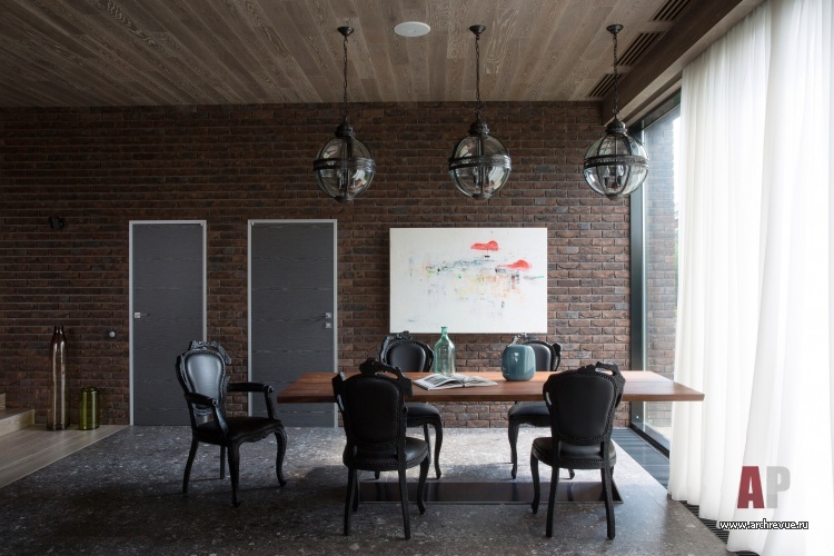 Основная декоративная идея – намеренно выставить напоказ внутреннюю красоту здания. Отсюда и кирпичные стены, и потолочные балки, и тонированное дерево, и фактуры под бетон, которые переходят с фасадов во внутреннее пространство.