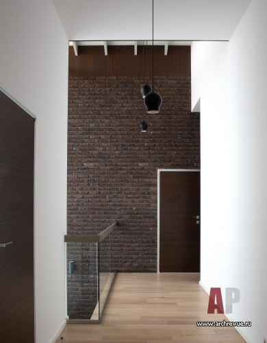 Двухэтажный дом выглядит брутально и монументально: его стены внутри и снаружи оформлены облицованным кирпичом ручной формовки, основательности добавляет двускатная крыша из керамической черепицы, которая будто придавливают здание к земле. В то же время панорамные фасадные витражи, открытые балки придают объему легкость и воздушность.