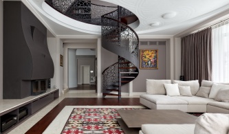 Жилое пространство организовано по вертикали: первый этаж занимает гостевая часть со сквозной планировкой. Гостиная, столовая, кухня, лестничный холл связаны друг с другом широкими открытыми проемами. Функциональные зоны обозначены системой подиумов со ступенями и имеют разный масштаб.