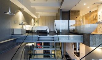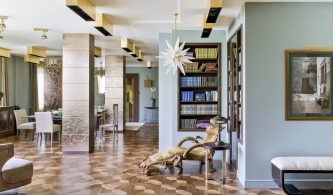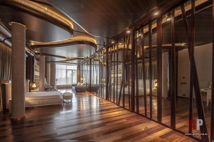 Верхние этажи занимают приватные помещения, гостевые спальни и помещения для отдыха и развлечений. Все – большие, просторные, с хорошими пропорциями. Архитекторы отделили приватный блок с помощью отдельного лифта, который доставляет в личные апартаменты, минуя парадную часть.