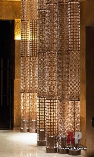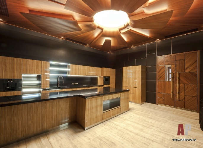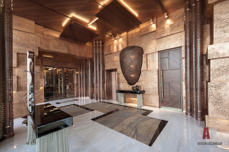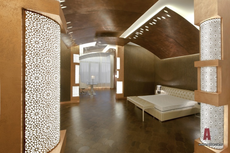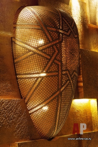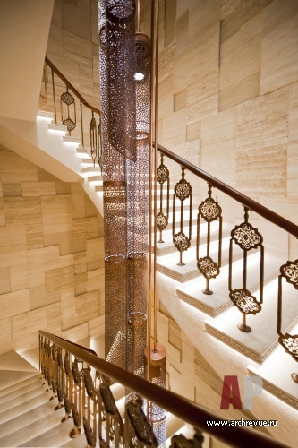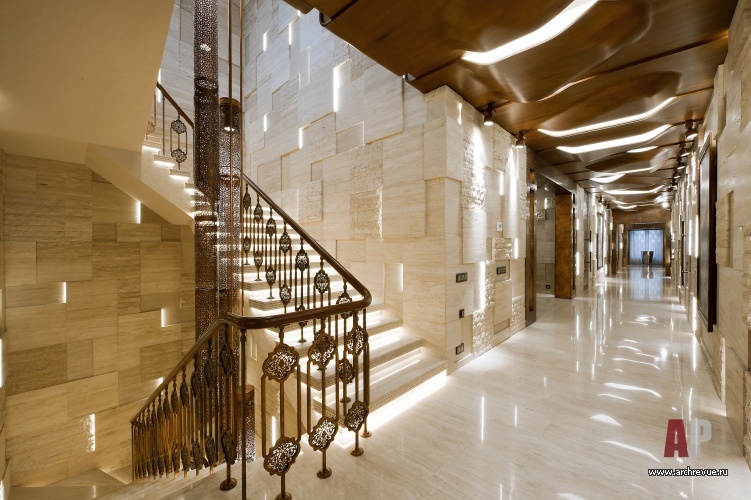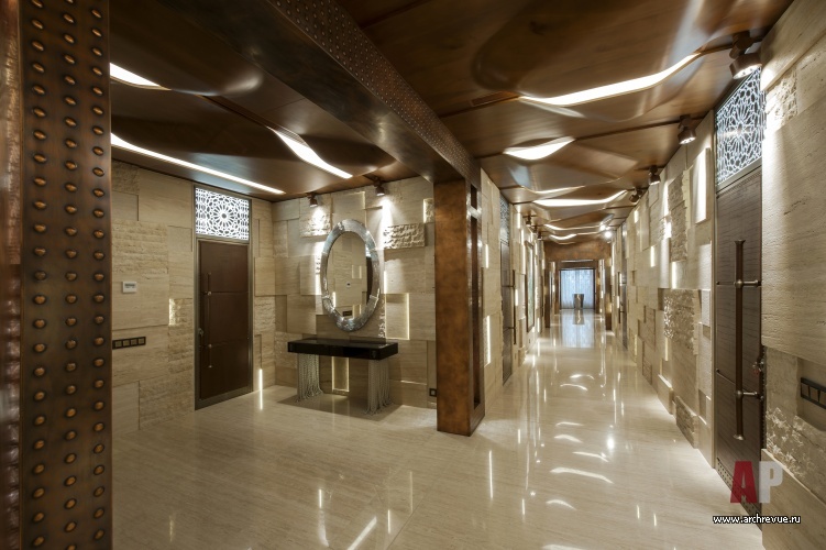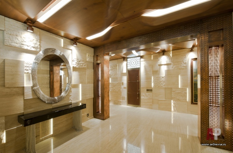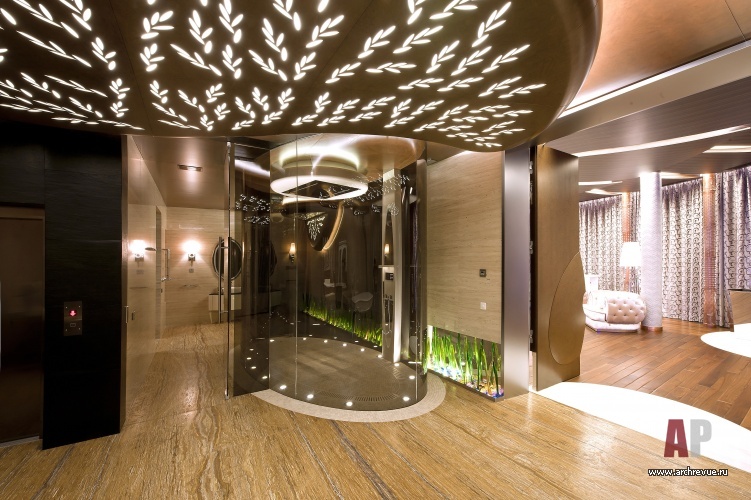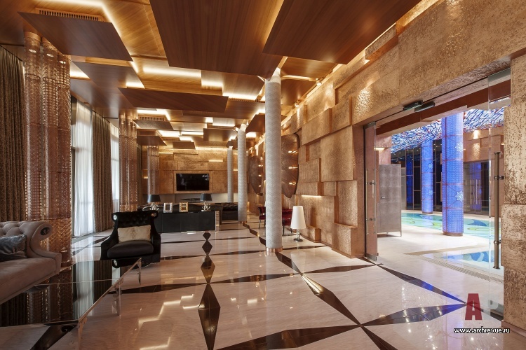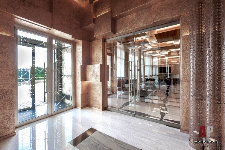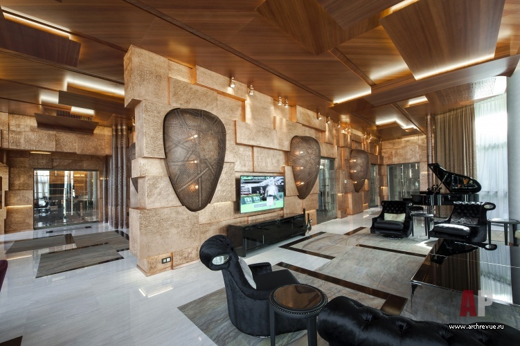 Стены в прихожей и парадном холле выложены травертином с грубой, античной фактурой, они сочетаются с декоративными рустами хромированных и зеркальных панелей с фацетами. Подсвеченный изнутри оникс использован в домашнем кинотеатре, кожаные панели – на кухне, каменная мозаика – в гостиной. В главной спальне ставка сделана на декоративное решение радиусного потолка (использованы панели с изгибом в трех плоскостях), а также кожаные и деревянные панели, резным деревянным орнаментом и контражурной подсветкой. Запоминающийся элемент интерьера – изделия из перфорированного металла: колонны, светильники, арт-объекты в форме яиц. Сквозь тончайший орнамент поникает свет, создавая причудливую игру свето-тени на стенах, полах и окружающих предметах. Вполне в духе этого яркого и театрального интерьера.