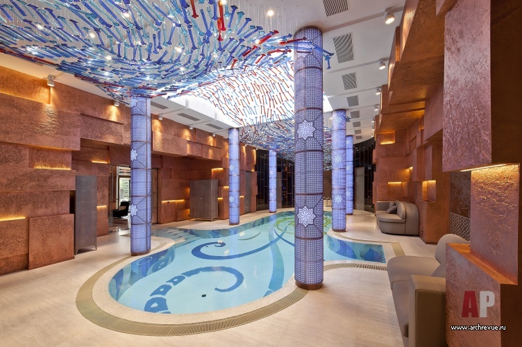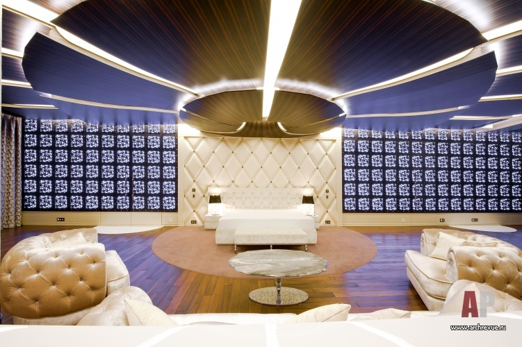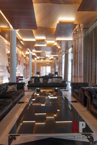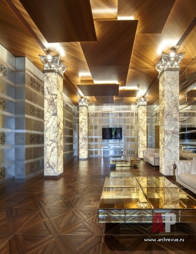 Характерная особенность этого авангардного интерьера – сложная пластика и рисунок стен и потолков, монументальность декоративных решений, разнообразие форм и фактур отделочных материалов, световые эффекты, которые складываются в фееричную картину. Так, в отделке стен гостиных использовались декоративные покрытия из сусальной меди и серебра, ими оформлены объемы выступающих кубов с подсветкой.