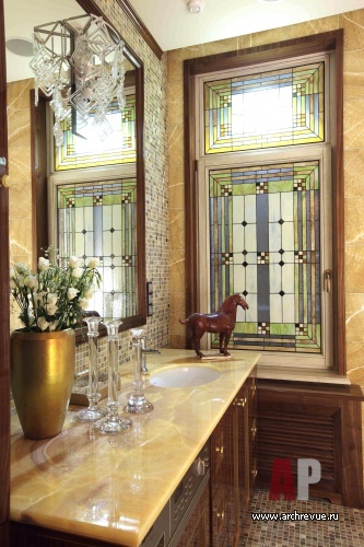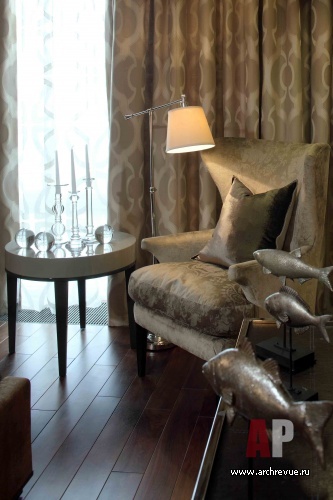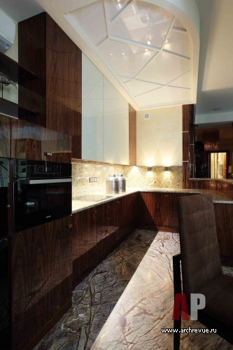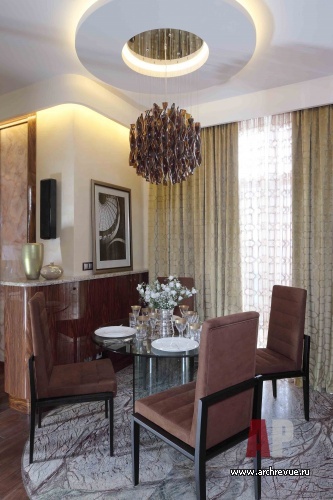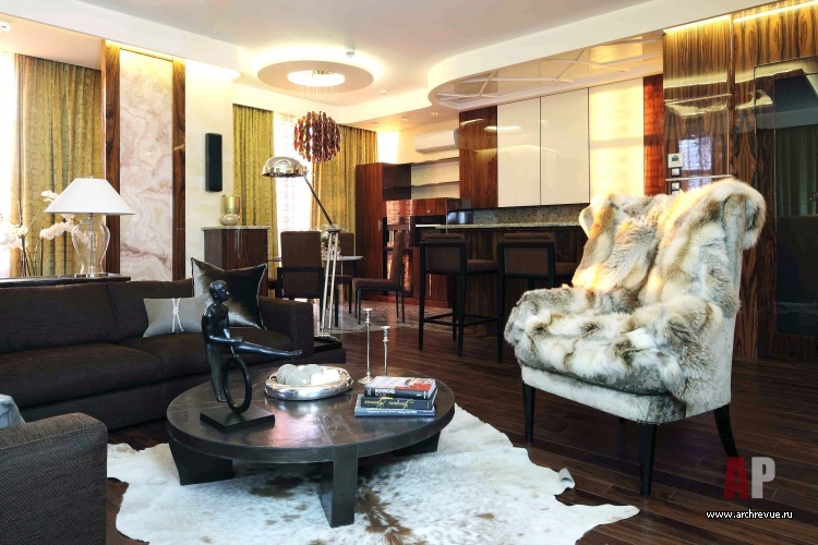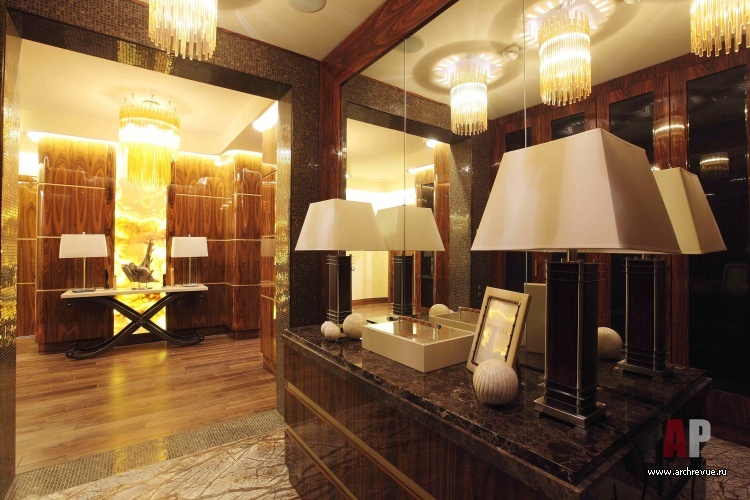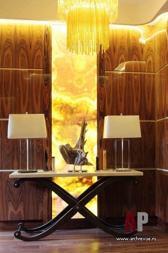 Семейная пара с ребенком обратилась к дизайнерам с пожеланием создать консервативный и респектабельный интерьер. Авторы проекта предложили в качестве основной декоративной темы стилистику ар-деко, но не с историческими цитатами, а в современном, «вольном» прочтении. Основную ставку они предложили сделать на богатых фактурах природных материалом: оникса, мрамора и экзотических пород дерева.