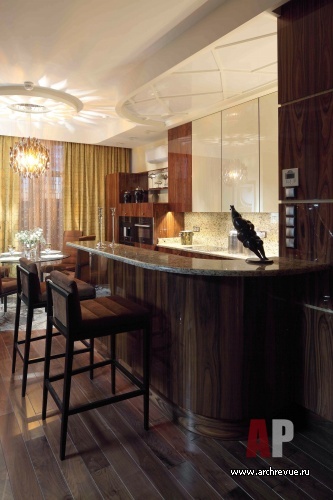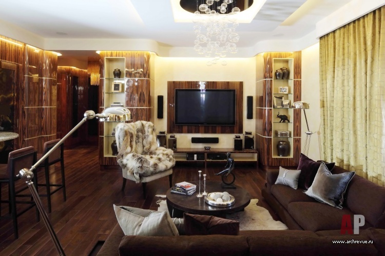 Интерьер выглядит зрелищно и почти театрально за счет использования дорогих материалов и теплой, солнечно-янтарной гаммы. Центральное место занимают изделия из экзотических пород дерева: стеновые панели, декоративные рамы, встроенная и корпусная мебель плавных очертаний из эбенового дерева и палисандра. Гостевую зону объединяет оригинальный гнутый гипсовый карниз, выполненный в стилистике ар-деко.