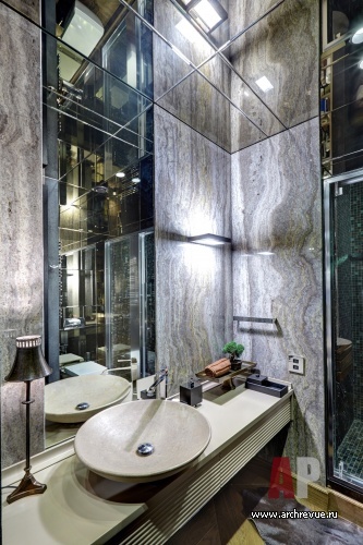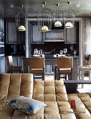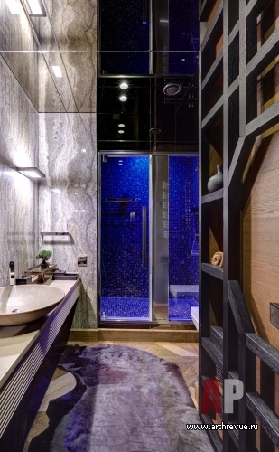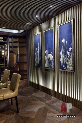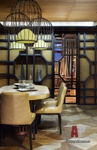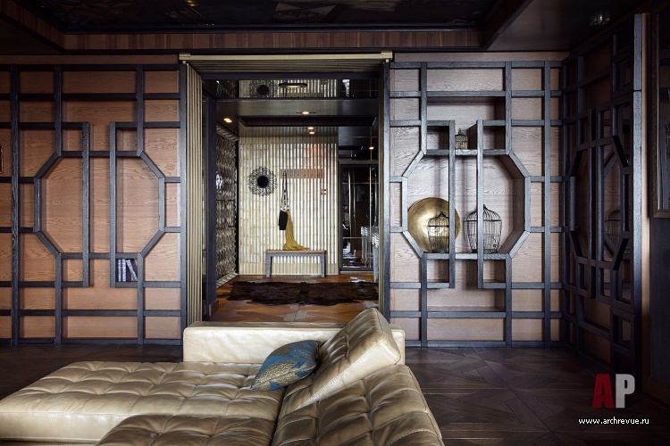 Квартира – работа полностью авторская, ажурные перегородки и двери из темного венге, стеновые панели из ореха и кожи, вся мебель (кроме кожных диванов и кресел), а также светильники-клетки создавались по эскизам автора проекта. Даже паркет тонировался в нужный оттенок вручную. В контрасте форм и фактур участие принимает природный камень: лабрадорит сложного оттенка, полированный известняк и вырезанный в виде косичек травертин. Важную роль играет подсветка, которая придает темному интерьеру внутреннее свечение.