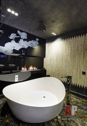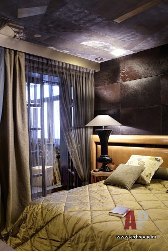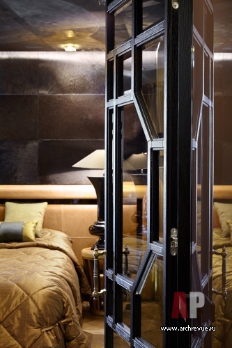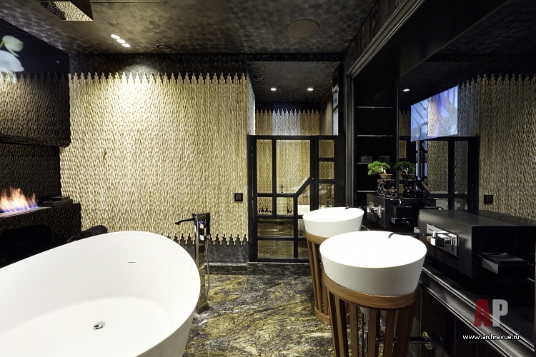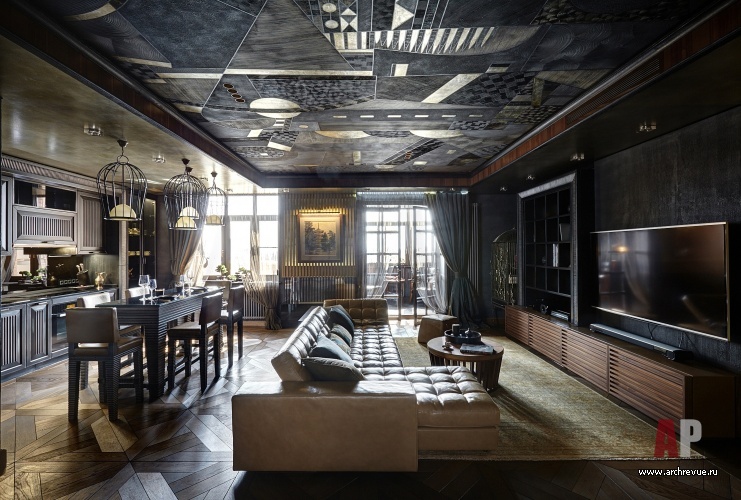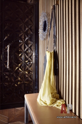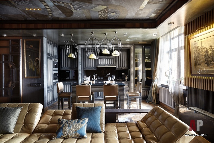 Интерьер квартиры – фантасмагория из черных цветов и редких фактур. Одних только видов декоративных стеновых покрытий здесь более десятка! Все они разработаны в индивидуальном порядке и имитируют многодельные интерьерные ткани. Важный стилеобразующий элемент гостиной – набранный из дерева и расписанный вручную потолочный плафон: в его рисунке обыгрываются авангардные работы Василия Кандинского.