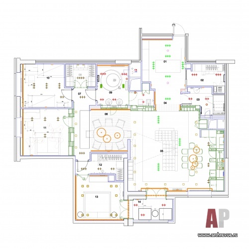 Значительную часть площади занимает общая зона кухни-гостиной, в самом темном месте (по центру пространства) находится столовая, недостаток солнечного света в ней компенсируют встроенные подсветки. Три спальни с гардеробными и ванными вынесены в отдельный блок.