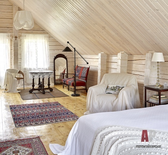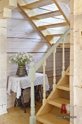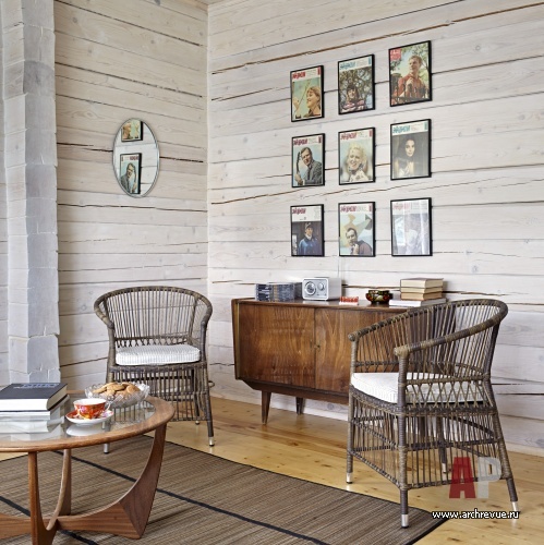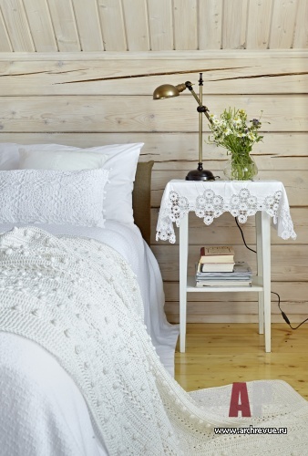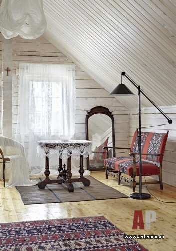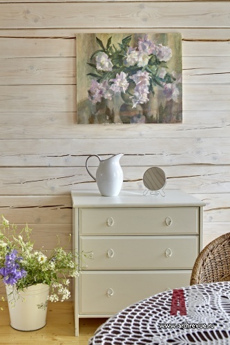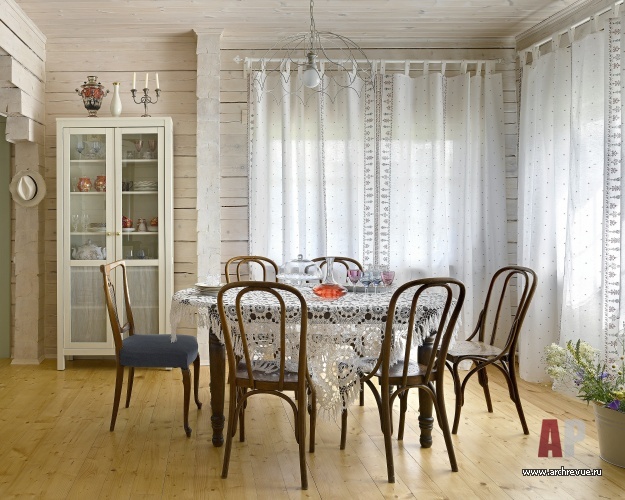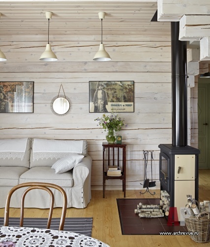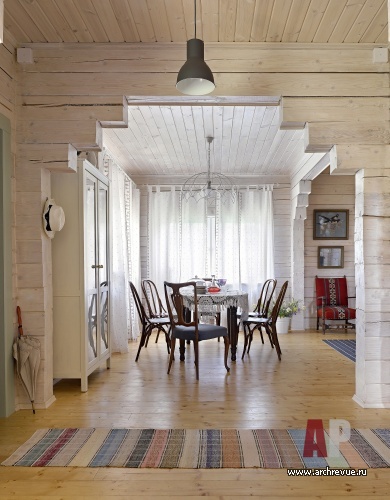 Оформляя интерьер, декоратор стремилась передать дачное настроение, какое бывает в июне или июле, когда солнце только встало, а на душе легко и радостно. И прежде всего она избавилась от желтизны деревянных стен, выкрасив брус лаком с белым оттенком.