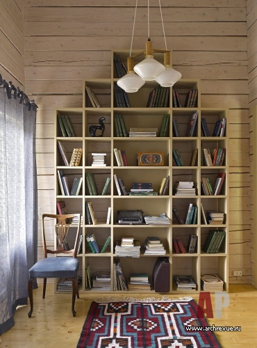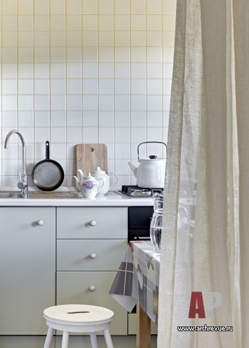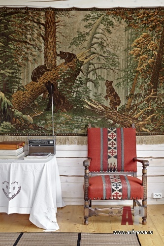 Все стены и потолки оформлены единообразно, двери, напротив, выделяются на общем фоне: они выкрашены в нежно-бирюзовый или пастельный голубой цвета. Практически каждый предмет мебели имеет свою историю, их появление сродни постепенному наполнению родового дома: часть осталась от родственников, другая – куплена по случаю, третья – переехала из городской квартиры, четвертая – сделана своими руками. Винтаж и антиквариат, приобретенный в антикварных лавках, дополняется артефактами из советской жизни: обложками журналов «Советский экран», ковром с репродукцией картины «Утро в сосновом лесу», шторами из ткани «Трехгорной мануфактуры».