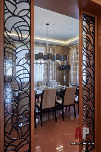 Первый этаж семейного дома имеет свободную планировку, отчего его интерьеры выглядят легче и воздушнее. Двухуровневый холл с парадной радиусной лестницей сменяется камерной гостиной. На одной оси с ней расположены кухня и столовая, оба помещения отделены перегородками из стекла и тонкого орнамента из черного лака. Вертикальные фрагменты в стиле ар-деко обрамляют открытые дверные проемы, они не перегораживают пространство и добавляют интерьеру художественную образность.