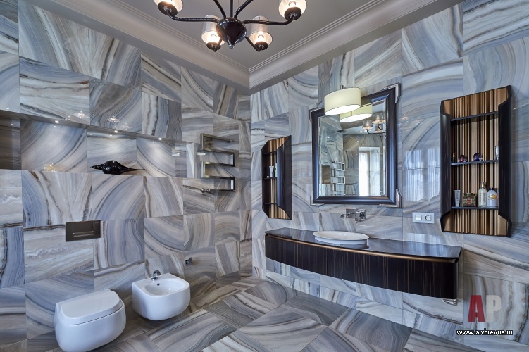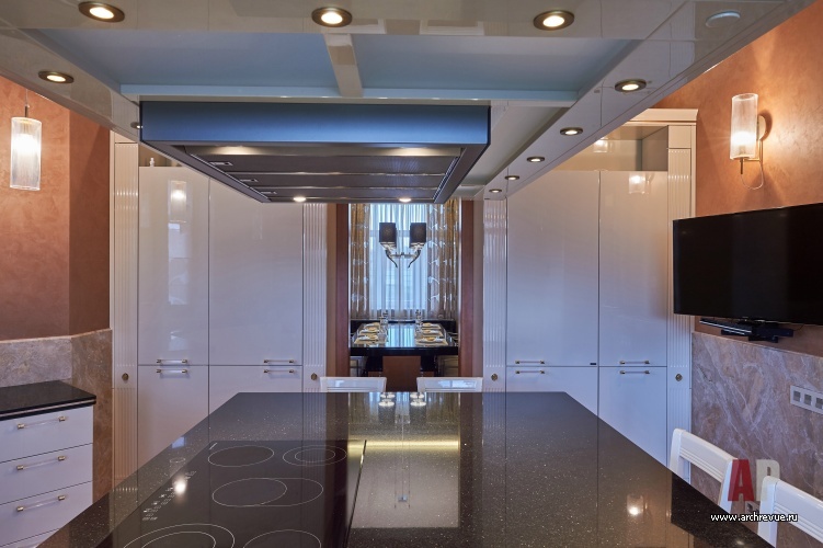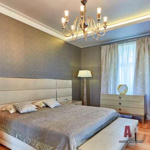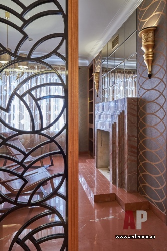 Интерьер исполнен в стилистике сдержанного ар-деко, его цветовая палитра построена на теплых пастельных фоновых цветах и роскошной фактуре мебели из экзотических пород дерева. При оформлении стен дизайнер реализовала необычное решение: кожаным и пышно декорированным деревянным буазери она предпочла лаконичные панели из крашеного дерева. Строгие прямоугольные панели молочно-бежевого цвета размером 60Х45 см придают помещениям торжественный вид и при этом не утяжеляют интерьер.