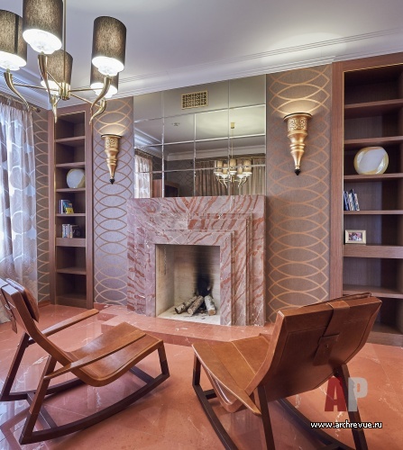 С цветом панелей сочетается теплый коралловый оттенок керамоганита, которым выложен пол первого этажа, и мраморного портала камина. Витражное обрамление дверных проемов из прозрачного стекла с контрастным орнаментом в стиле ар-деко, а также выдержанная в духе начала ХХ века мебель итальянских брендов, придают дому законченный вид.