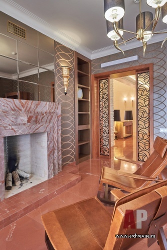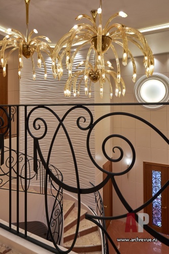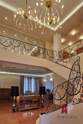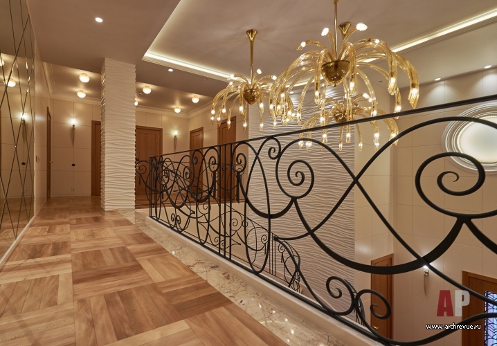 В той же манере оформлен и дверной портал каминного зала с приватной гостиной. Второй этаж занимают спальни, гардеробные и санузлы; на мансарде организована развлекательная зона.
