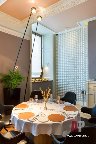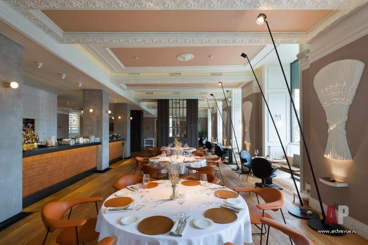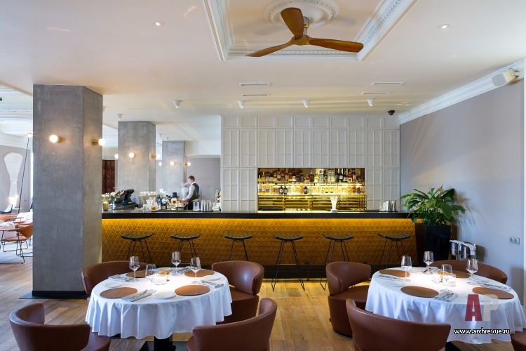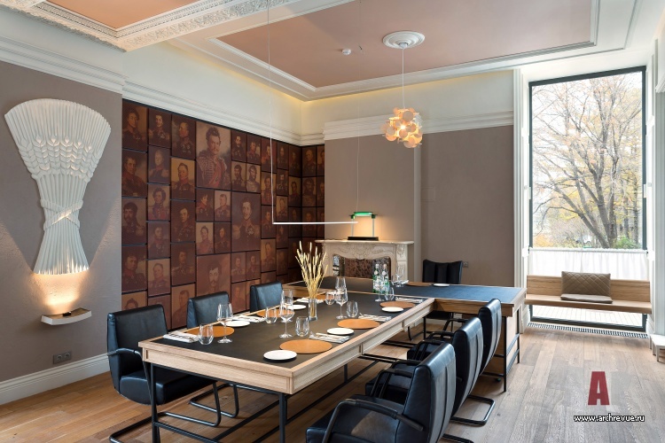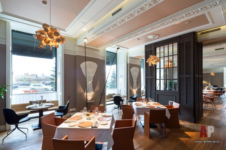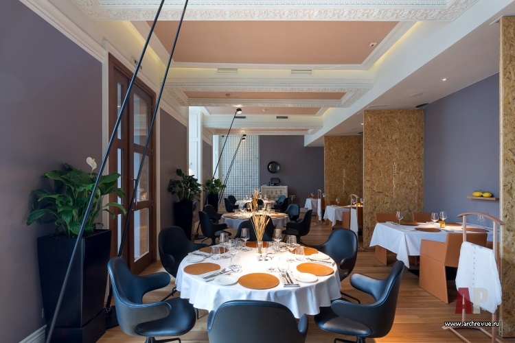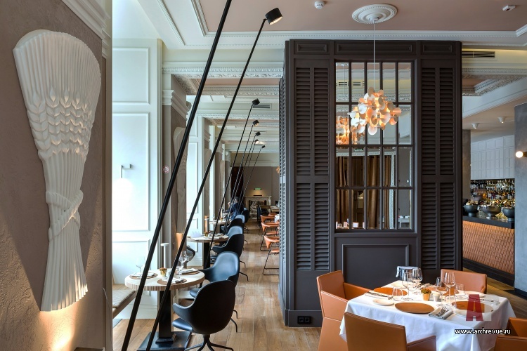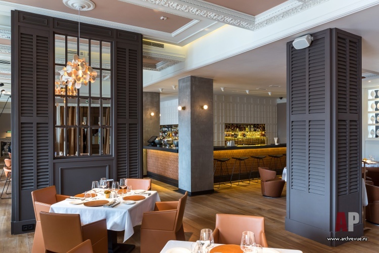 Ресторан имеет сквозную планировку: два его зала связаны большим проходом. Столики зонированы перегородками из темного дерева с зеркальными вставками. Отдельно выделена барная зона: две ее стены зашиты белыми деревянными панелями с филенками в неоклассическом стиле. Зал ресторана с камином обставлен по принципу дворянского кабинета XIX века: значительное место здесь занимает большой Т-образный стол, удобный для проведения банкетов и ужинов больших компаний.