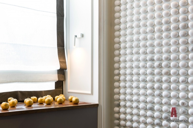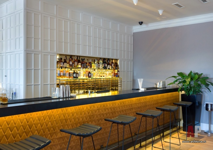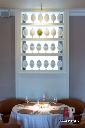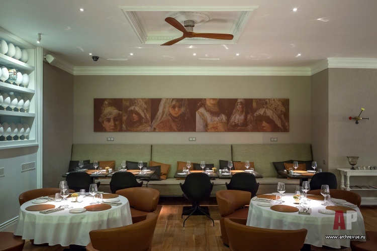 Яркую образность интерьеру придают арт-объекты. В их числе и гипсовые барельефы в виде снопов пшеницы работы скульптора Ирина Жук, которые отсылают к советской эпохе, и выложенная гипсовыми булыжниками стена, и лежащие на полках лимоны со встроенными светодиодами, и портреты русских полководцев времен Александра I. Затянутые тонкой медной сеткой они кажутся словно поблекшими от времени… Советский антураж дополняют детали в стиле русской усадебной культуры: пышные лепные карнизы, дубовый паркет, яйца Фаберже.