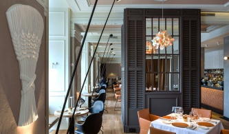 Столярные изделия – двери, высокий плинтус, встроенные элементы выполнены из дерева с финишем из белой эмали, роскошный каменный «ковер» в холле исполнен в светлых бежевых цветах, обои с классическим орнаментом имитируют тканные золотом полотна… Чтобы не перегружать интерьер, лепные элементы было решено оставить молочно-белыми, не золотить их и не патинировать. Чистый цвет придал интерьеру благородный вид. На золотистом фоне выделяется лишь кухня: выполненная в черном цвете она служит декоративным акцентом общей гостиной.