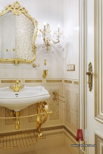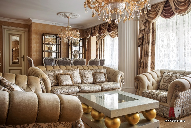 Работая над проектом, декоратор стремилась создать парадный классический интерьер, который выглядел бы легким и воздушным. Поэтому при выборе отделочных материалов и аксессуаров она отдавала предпочтение предметам в светлой золотисто-бежевой гамме, которая визуально расширяет пространство.