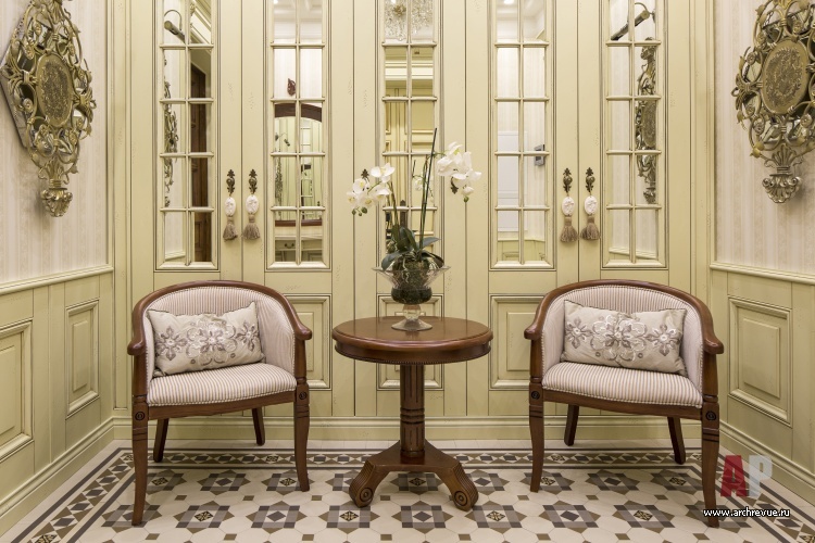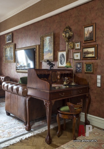 Парадный интерьер выполнен в английской классике, с нотами винтажа и антикварными предметами. Квартира изначально имела прекрасные характеристики: высокие потолки, вытянутые вдоль фасада окна, классический лепной декор… Лепные карнизы и розетки автор проекта сохранила, как и добротные паркетные полы, а также массивные дубовые двери ручной работы.