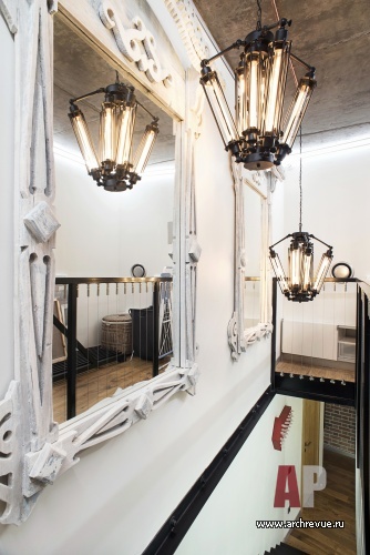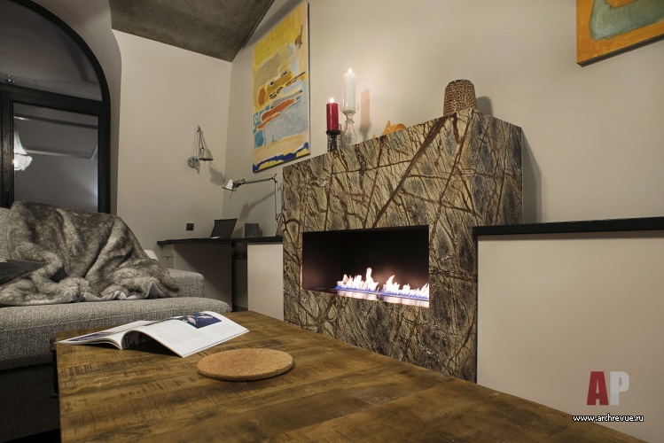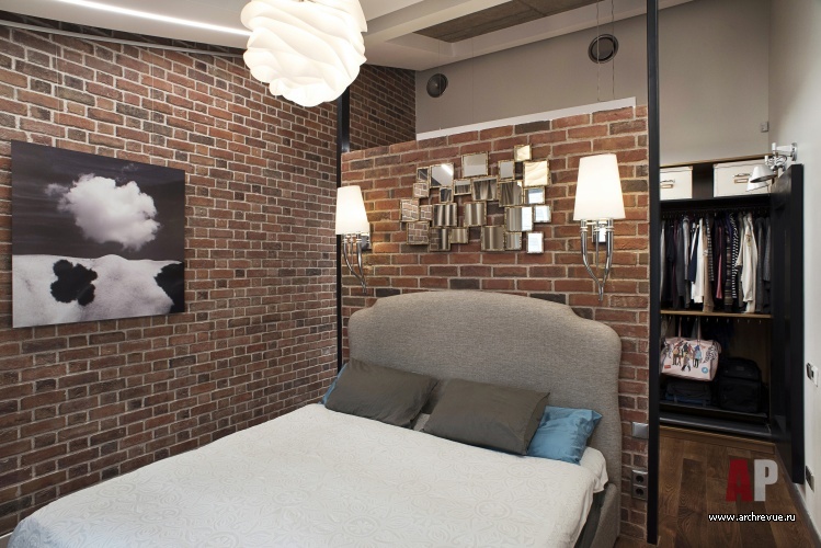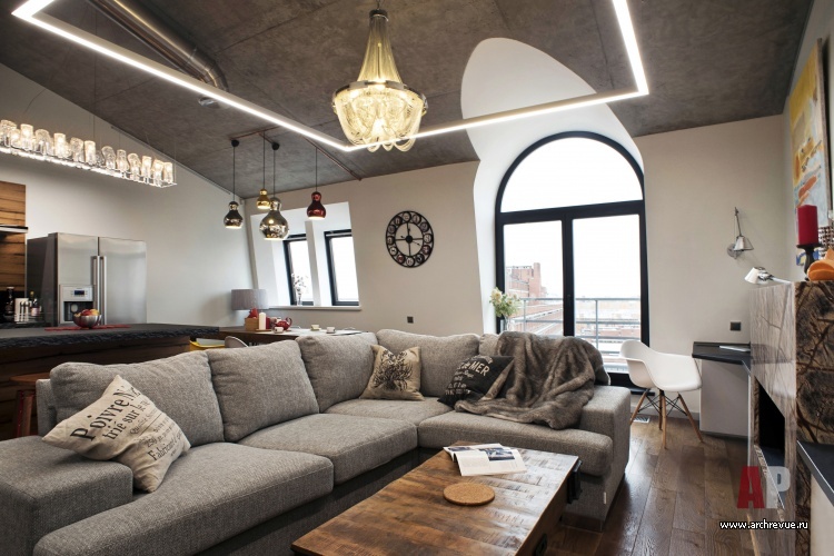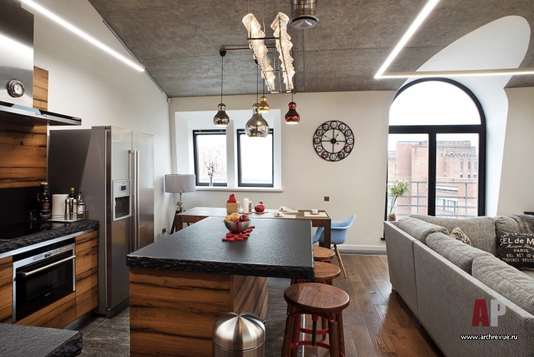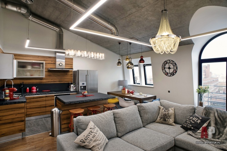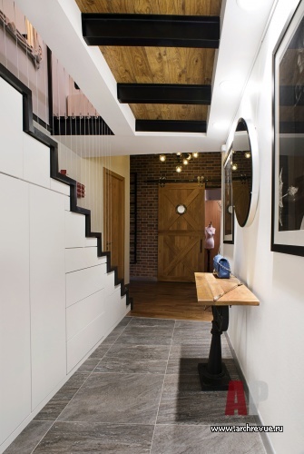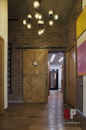 Интерьер решен в современной стилистике с приметами индустриального дизайна. Открытая кирпичная кладка, поверхности с фактурой бетона, сварная металлическая лестница с подвесными тросами, светодиодная подсветка придают ему сходство с американским лофтом. В то же время деревянные изделия (пол, массивная раздвижная дверь, фасады кухни), уютный текстиль и дизайнерские неоклассические светильники дают ощущение тепла и уюта.