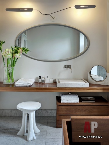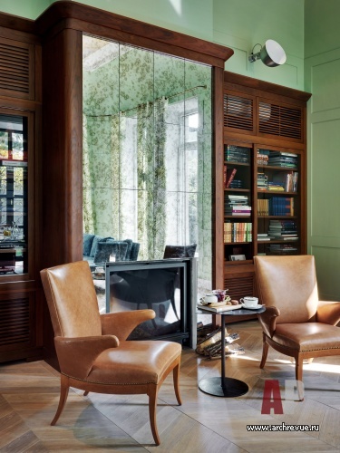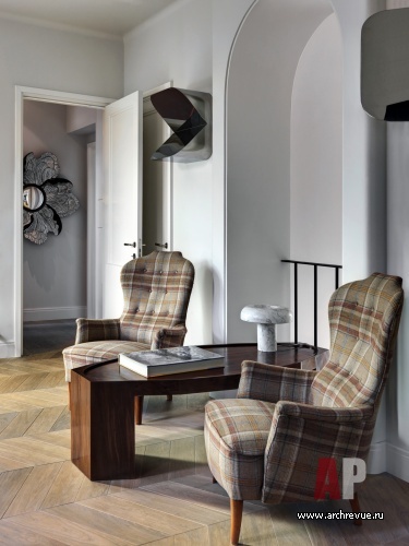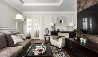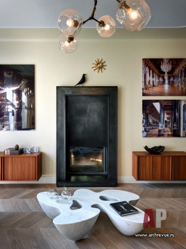Сложившаяся композиция задает общий вектор, определяет стилистику и качество элементов, но в то же время стимулирует на поиск новых выразительных вещей. И интерьер продолжает жить во времени… Особая черта этого интерьера – контраст между педантичной выдержанностью исторического стиля и современными объектами и материалами. В оформлении использованы простые, но качественные, материалы: юрский мрамор, сланец, изделия из древесины дуба и ореха и ткани от ведущих мировых мануфактур.
