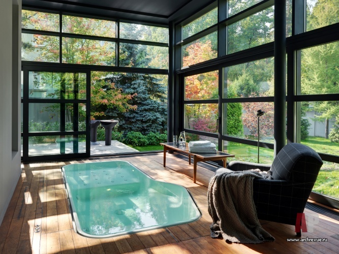 Справа от нее находится кухня, слева – столовая и гостиная с проходом в кабинет. На втором этаже спроектированы личные помещения детей, на третьем – хозяйская спальня с гардеробными, а также с пристройкой-башней, где расположился небольшой спортзал и кинотеатр.