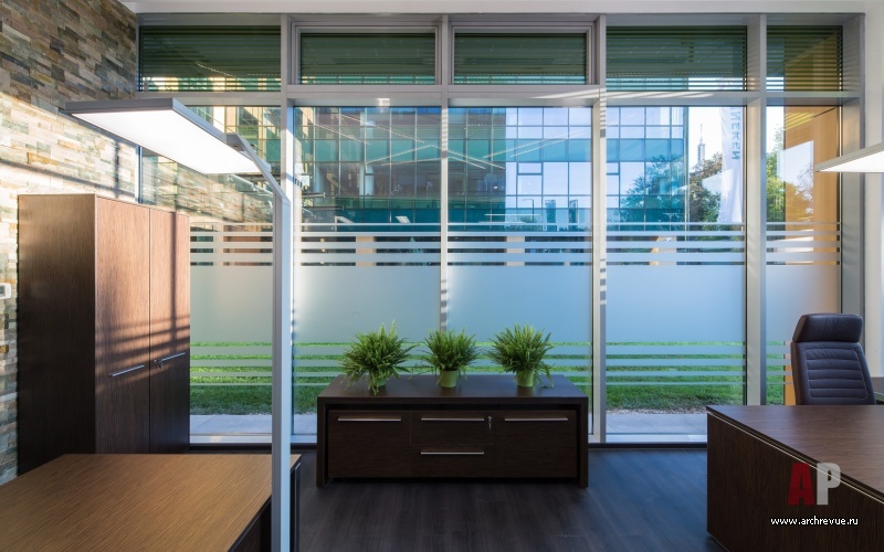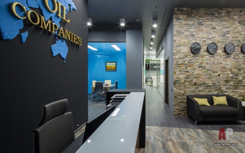 Строгая геометрия, использование фирменной символики и синих оттенков – таков облик офиса. Интерьер оформлен в строгом современном стиле с использованием современных материалов: перегородок из стекла, звукоизоляционных панелей, звукопоглощающих подвесных потолочных систем и смягчающих шаги напольных покрытий. Уютную обстановку в хай-тековом пространстве создают изделия из светлого дерева, пиленый камень в отделке стен и монументальные белоснежные барельефы в главной переговорной.