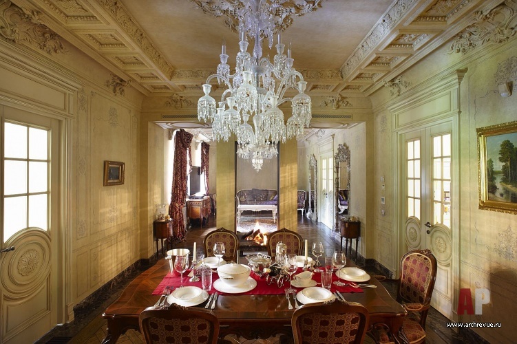 Инкрустированный камнем наборный паркет, состаренные зеркала, патинированные буазери и дверные полотна с резным орнаментом, пышные хрустальные люстры, играющий полутонами текстиль, антикварные изделия – все складывается в многоплановый, подробно проработанный интерьер с историей. Изящный, благородный и искрящийся перламутровыми всполохами.
