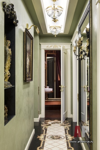Интерьер выполнен в классической манере с обилием авторских решений и изделий: художественные витражи, зеркальные панно, расписанные вручную потолочные плафоны, уложенные на дворцовый манер паркетные полы, фрески, лепной декор, фактуры из состаренного дерева, финиши из серебряной потали – все эти подробности складываются в плотный декоративный ряд.