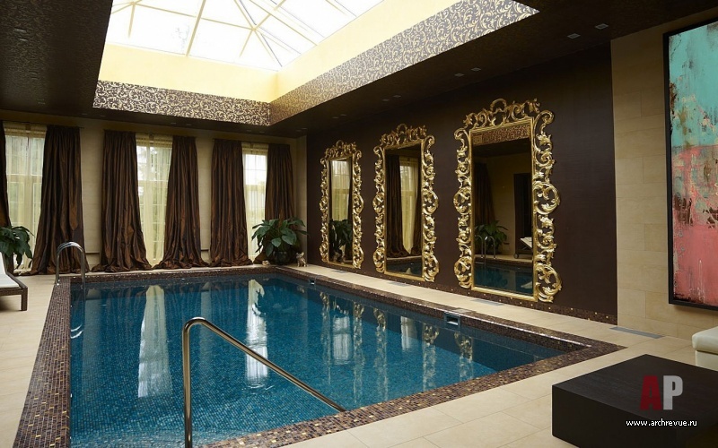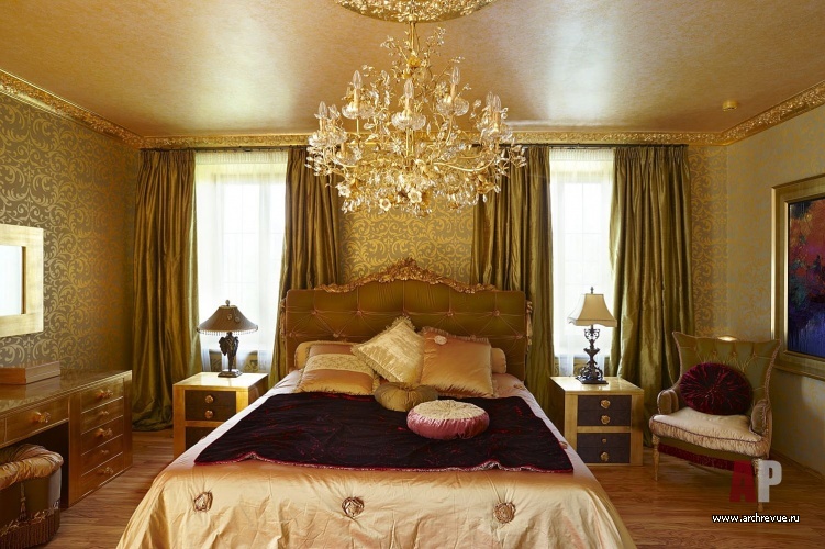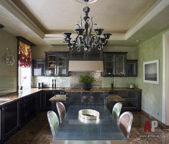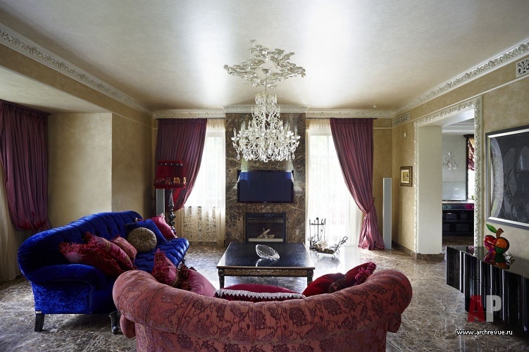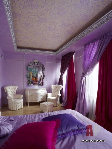 В интерьере ставка сделана на игру фактур и контрастные сочетания цветов и материалов: дерева, камня, зеркал, декоративных финишей с использованием серебряной и золотой потали, трафаретной росписи с растительным орнаментом. Каждое из помещений дома обладает своим, индивидуальным характером, который подчеркнут выбором цветового решения. В серебряной гостиной на внимание акцентировано на лилово-фиолетовом текстиле, который используется в обивке мебели и оформлении окон.