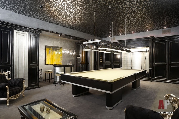 Приватные хозяйские помещения решены в нейтральных оливково-золотистых тонах, гостевая спальня, напротив, выделена активным фиолетовым цветом, а бильярдная за счет декоративных финишей и патинированных буазери и вовсе решена на контрасте черного и серебра.