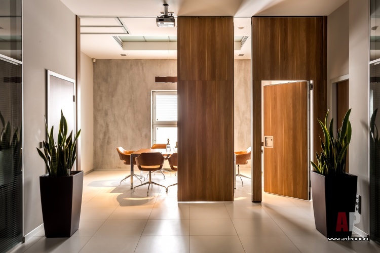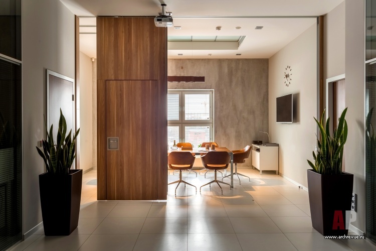 В отсутствие же собраний все части перегородки уходят за стену, в специальные пеналы. При необходимости можно выдвинуть одну или две секции и частично изолировать помещение, или же, напротив, закрыть все створки и разделить пространство на две самостоятельные рабочие зоны. Помимо прочего система мобильных перегородок работает на идею естественной освещенности всего объема офиса.