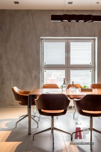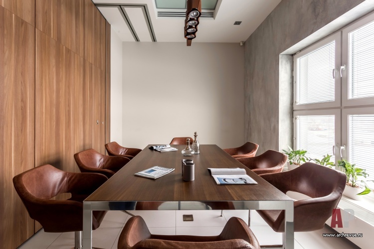 Сами архитекторы концепцию проекта определили как «лофт лайт» - индустриальное пространство без исторической стилизации под фабрику или завод начала ХХ века, интерьер предельно современный и функциональный. Органичная минималистской архитектуре бизнес-комплекса среда создана с помощью открытых элементов технических конструкций, материалов с фактурой под ржавый металл и бетон, стеклянных перегородок и мебели геометрически правильных форм. Теплоту в индустриальный интерьер вносят раздвижные перегородки из древесины ореха и отделка мебели кожей коричневых оттенков.