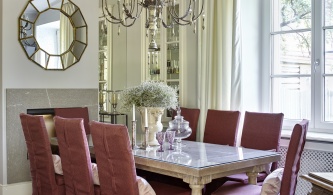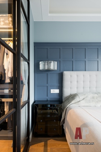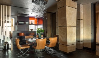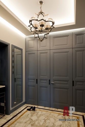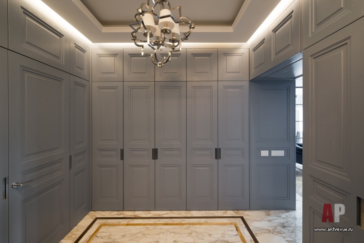 Эклектичная квартира выглядит необычайно цельно, во многом за счет оформлении помещений общественной зоны (холла, гостиной, коридоров) как единого ансамбля. Стеновые панели, фасады встроенных шкафов и гардеробных, ведущие в личные комнаты скрытые двери выполнены в сходном дизайне с единым рисунком и цветом.