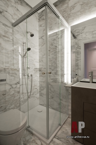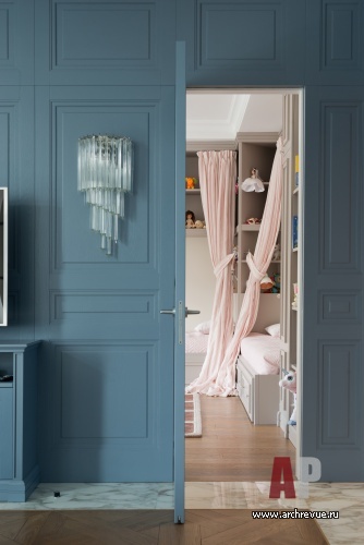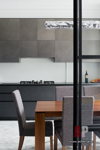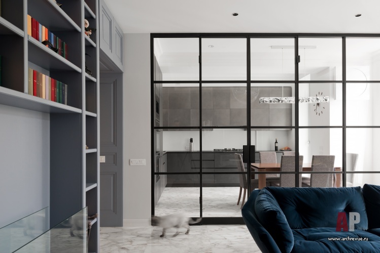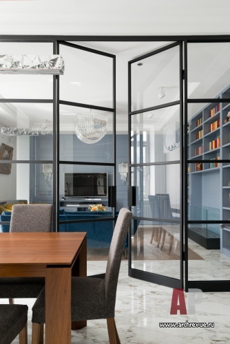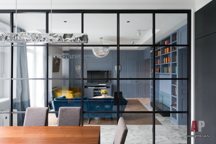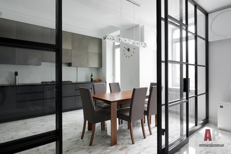 Санузлы также вынесены в центральную, темную часть квартиры: хозяйская ванная расположена в дальней части квартиры, а гостевой санузел вынесен по центру (с одной стороны он примыкает к зоне камина, с другой – к гардеробной при хозяйской спальне), место ему удалось найти благодаря реконструкции длинного коридора. В целях рационального использования площадей решено было отказаться от лишних дверей в общественной зоне и объединить кухню с гостиной с помощью мобильной перегородки из черного металла и прозрачного стекла. Дверь в детскую решена в едином дизайне со стеновыми панелями, и полностью растворяется на их фоне.