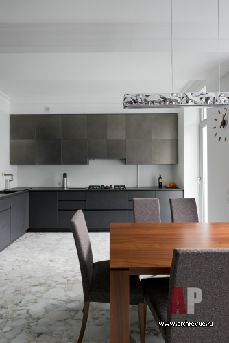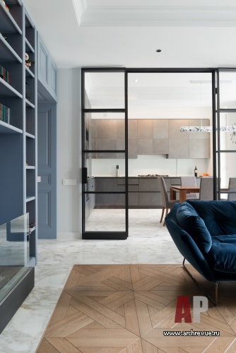 Все они созданы по эскизам из древесины дуба с классическими филенками и рифмуются с традиционным модульным паркетом. На контрасте в гостиной и спальне появились брутальные стеклянные перегородки в черном металлическом обрамлении. А ультрасовременная high-tech кухня из черного керлита и тонированного металла и вовсе встала на белый мрамор под классические лепные потолочные карнизы. Для каждого помещения выбрано отдельное колористическое решение на базе ярких и насыщенных тонов и цвета московского неба: то выбеленного от солнца, то полного облаков, то грозно-предгрозового…