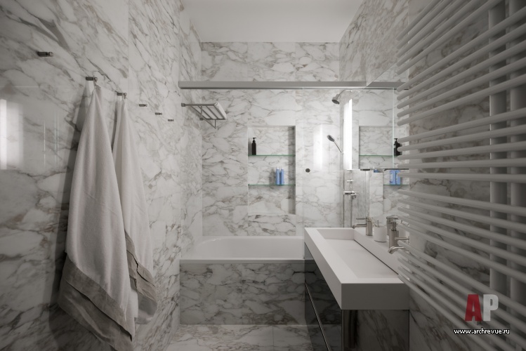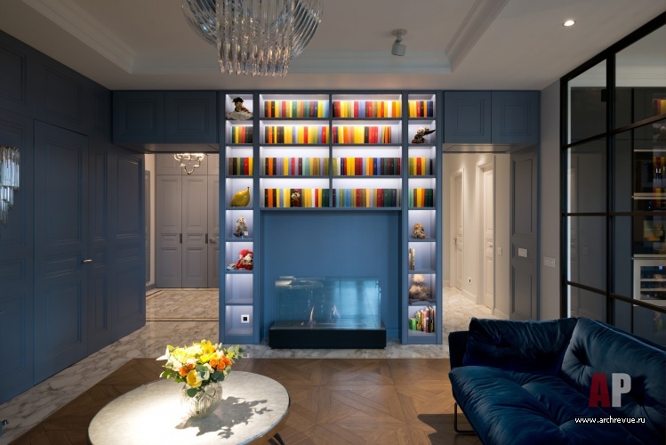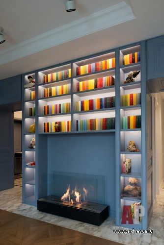 Расположенный по центру объема холл делит пространство квартиры на два блока: слева находятся две спальни и кабинет, справа – общая зона и детская комната. Вход в левую часть приватных помещений осуществляется через гостиную: зона камина с библиотекой окружена симметричными дверными проемами (один ведет из холла в гостиную, другой – из гостиной в приватный блок).