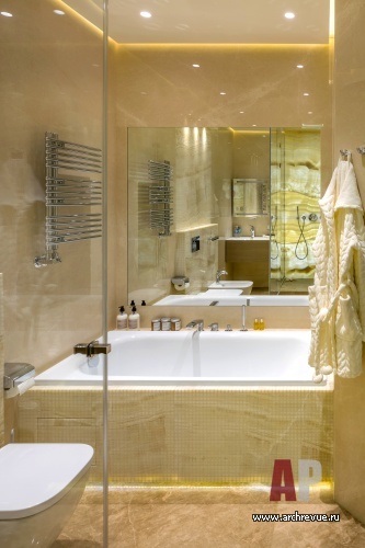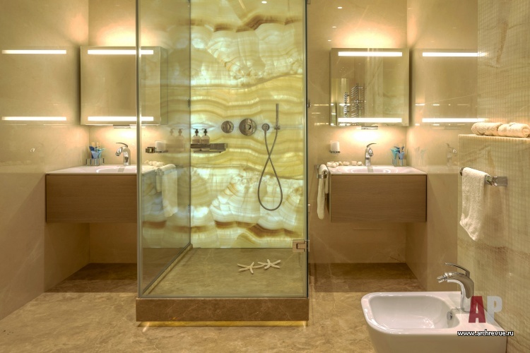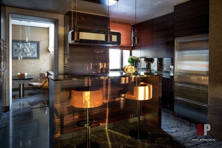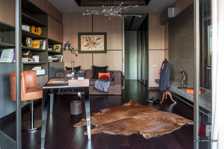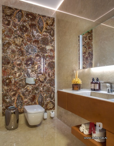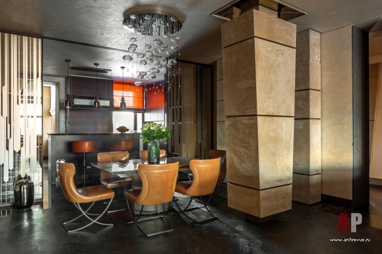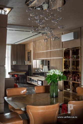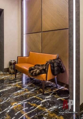 В оформлении интерьера ставка была сделана на натуральные материалы и цвета, которые ассоциируются с природной тематикой. Но не спокойно нейтральные, а как требуют законы стиля ар-деко роскошные, эффектные, с богатой фактурой. Оникс, мрамор, полудрагоценные камни, привычные и экзотические породы дерева (розовый дуб, серый дуб, эбеновое дерево, орех) и главный акцент – оригинальные стеновые панели из нубука цвета мокко – создают образ современного респектабельного интерьера.