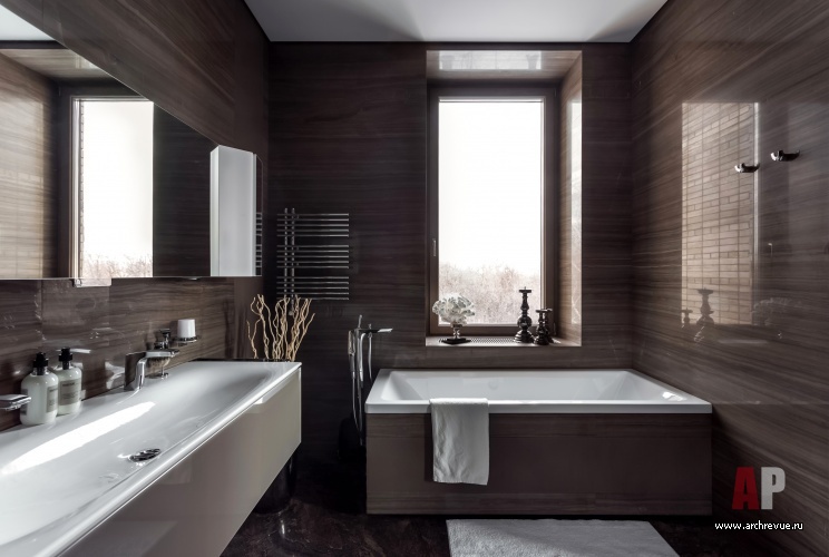 Тема близости к природе и расположение в знаковом историческом месте, где в советские годы жила партийная и творческая элита, определили ее парадную стилистику, настроение, выбор отделочных материалов и решений.