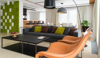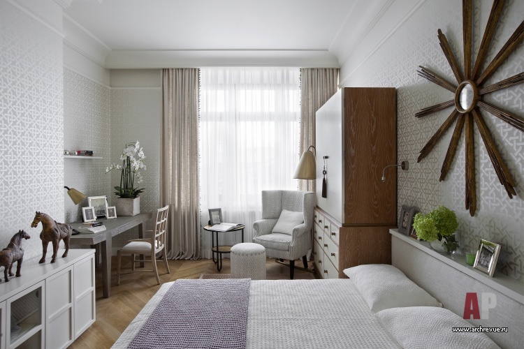 Удобная диванная группа, уютная зона у камина, кофейный столик на двоих – именно на них сделан акцент в общей гостиной. Помимо общей зоны в квартире расположены две спальни: просторная хозяйская, с французским окном и собственной ванной комнатой, а также гостевая, где иногда останавливается дочь, со своим санузлом.