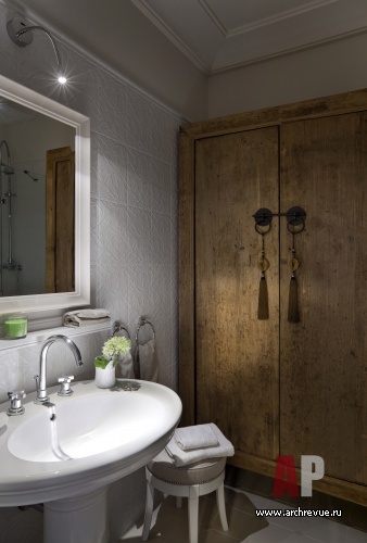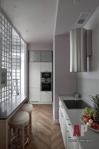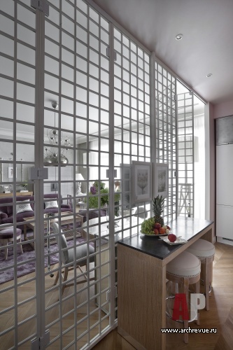 Поскольку квартира создавалась как место для отдыха и вообще объект чисто эстетский, функции в ней отводилась роль второстепенная. Бесспорно, она должна была присутствовать, но незримо, как в пятизвездочном отеле, где удобство и эргономика доведены до совершенства. Поэтому кухня здесь занимает минимум места, она изящно завуалирована: размещена в нише и замаскирована решетчатыми перегородками, имитирующими садовое берсо.