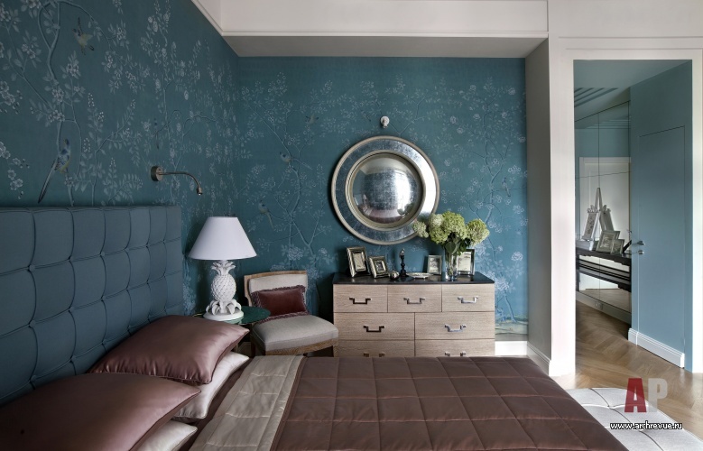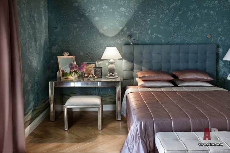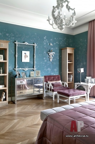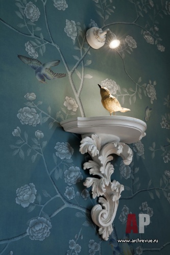 Ведущий мотив интерьера – цветущий сад, пышный и женственный. Цветочные орнаменты, решетчатый декор-берсо, птицы, перголы, изящные переплетения – все эти стилизованные элементы создают образ не места и времени. Романтичный настрой поддерживает колористика: пыльно-розовый, пионовый, темно-бирюзовый и серебристо-жемчужный цвета.