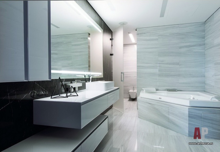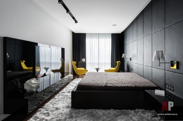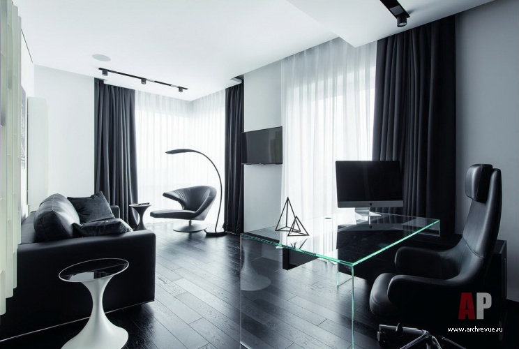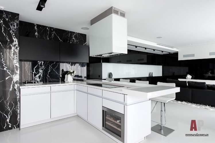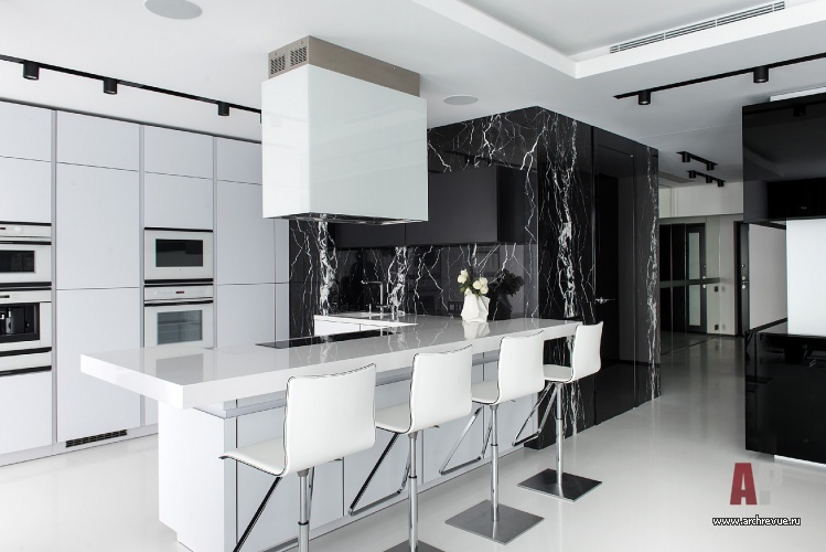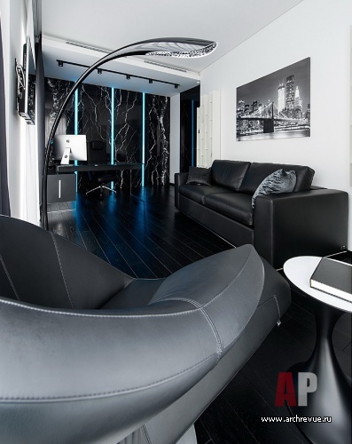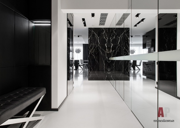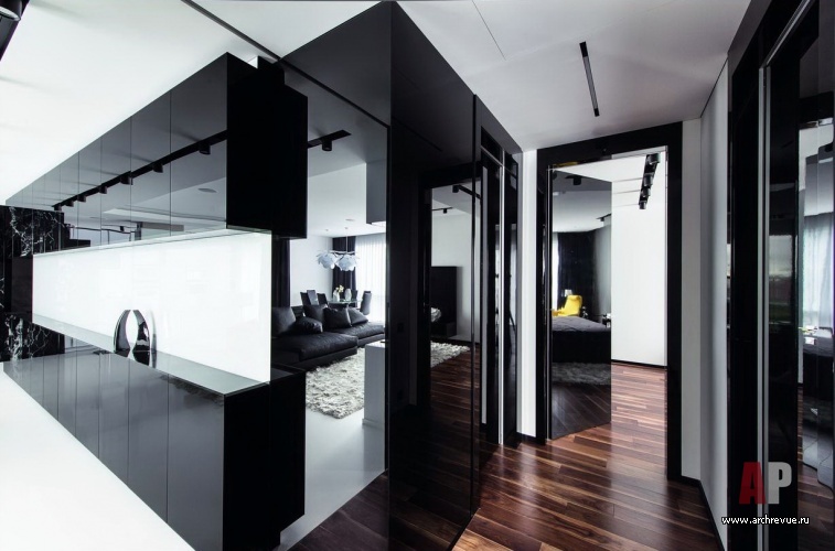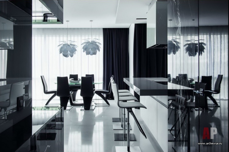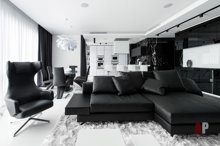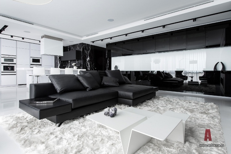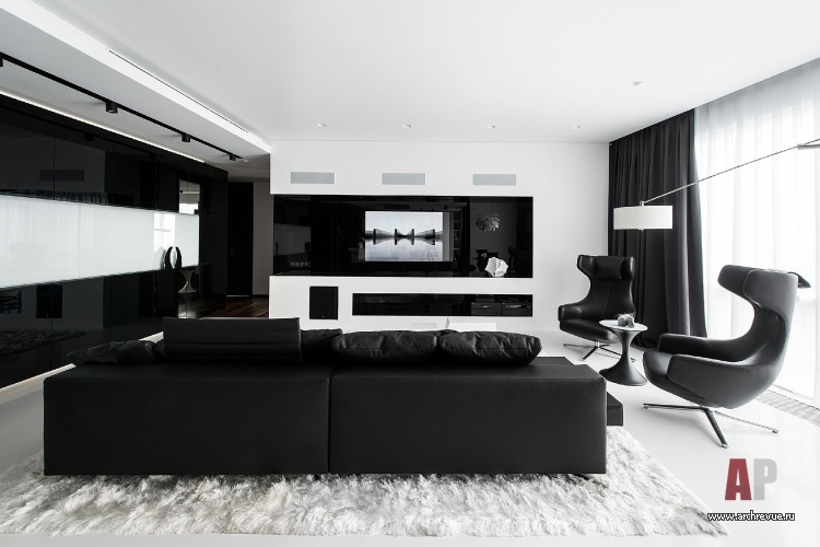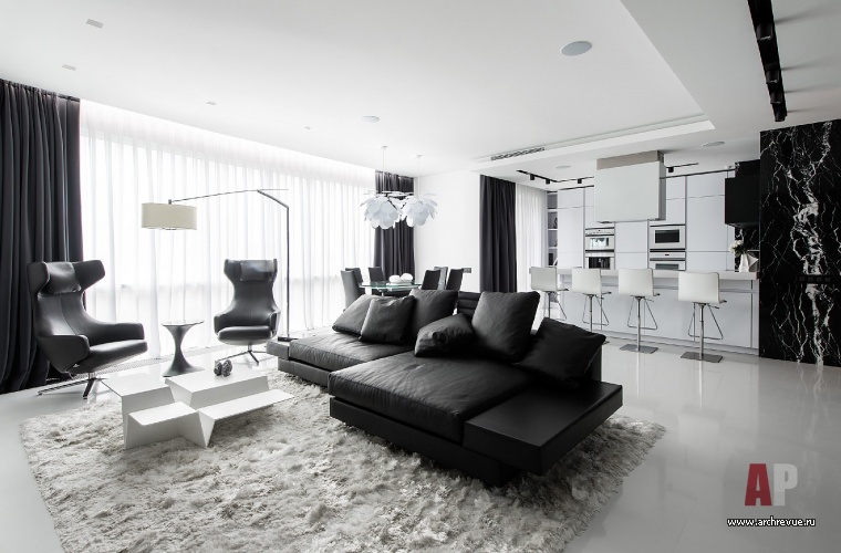 Для молодой семейной пары архитекторы спроектировали монохромную квартиру в ультрасовременном стиле. Интерьер решен как единое целое, непрерывная композиция в черно-белой гамме, с контрастным сочетанием глянцевых поверхностей, камня, стекла, кожи. За основу проекта авторы взяли идею эргономичного пространства и продуманного до мелочей стильного черно-белого ансамбля.