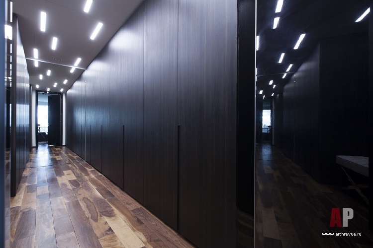 Интерьер решен как законченная композиция, функциональные зоны объединены с помощью одинаковых декоративных приемов и материалов. Лаконичный по дизайну и наполнению объем визуально усложняется благодаря использованию бликующих поверхностей (черного стекла, полированных стеновых панелей и фасадов мебели) и комбинации материалов с контрастной фактурой и цветом.