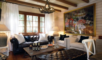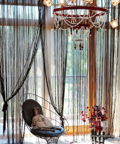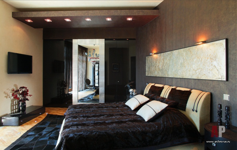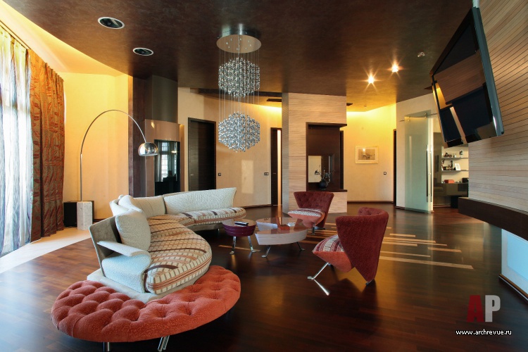 Выигрышный дизайнерский ход – темные потолки, которые зрительно расширяют пространство и увеличивают высоту помещений. Так, в гостиной потолок покрыт семью слоями специального финиша, каждый из них имеет свой оттенок, которые в сумме дают сложный темный цвет.