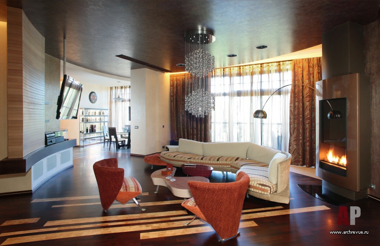 Динамику пространства подчеркивают декоративные детали: например, несущие элементы, облицованные горизонтальными деревянными плашками, дизайнерская мебель непростых форм, светлые вставки ясеня в полу. Они как сполохи света расходятся от камина по полу, превращая его в супрематическое полотно…