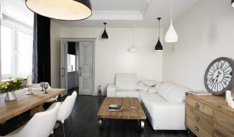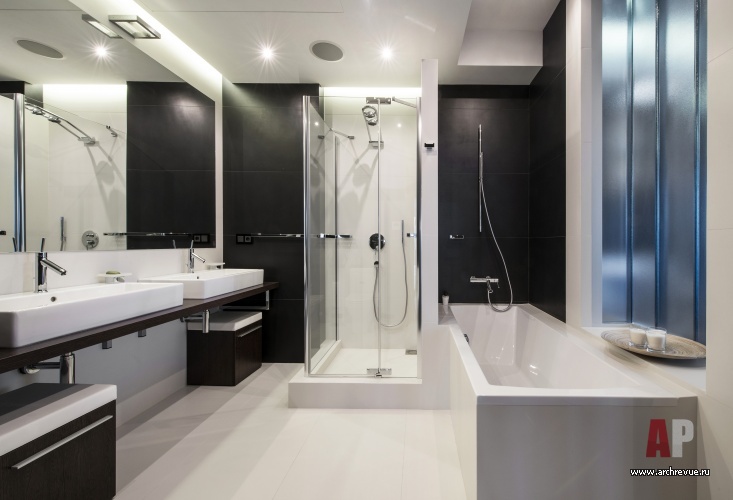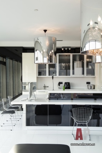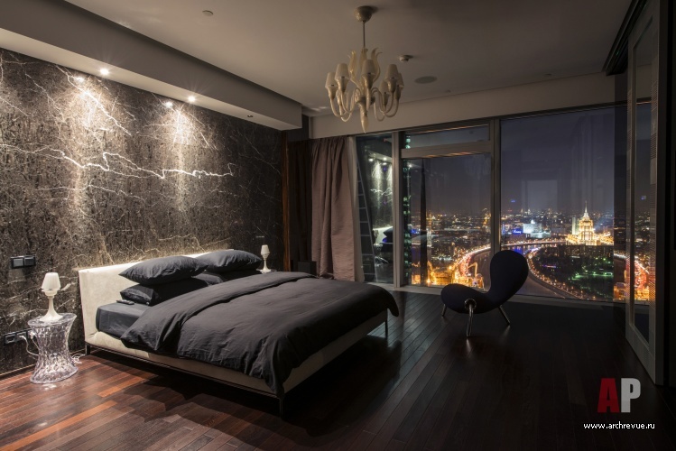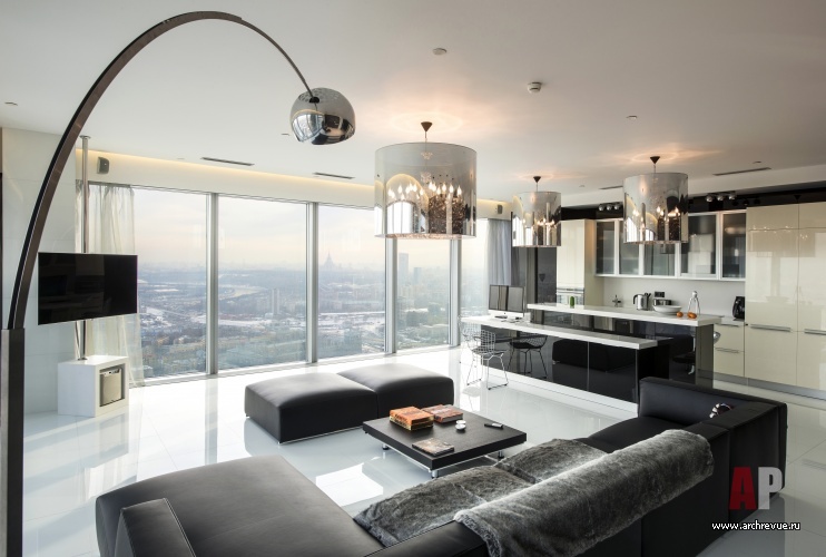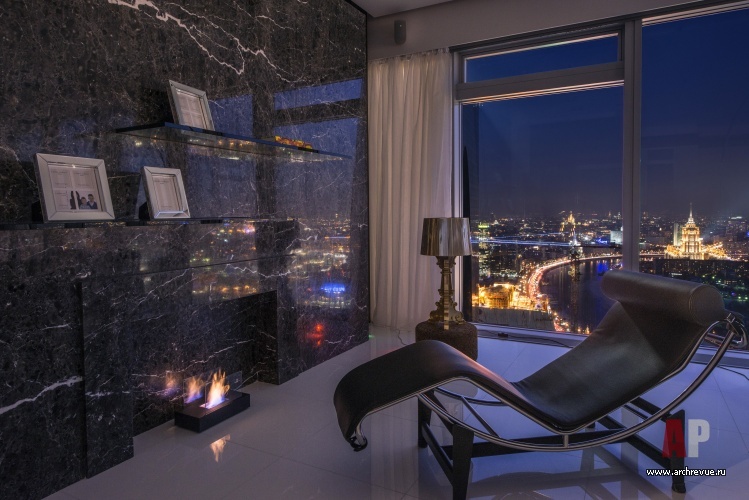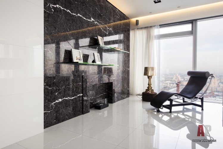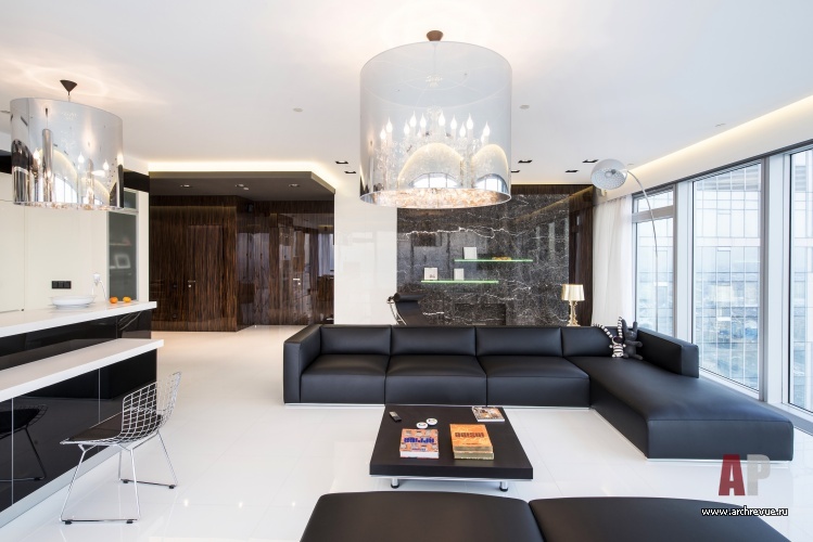 Современный интерьер строится на контрастах материалов и цветов, фактур и форм. Архитектор оперирует большими плоскостями и заливками, лепит объем, достигая эффекта монолитной композиции. Белый глянец (в отделке пола, фасада кухни), черные акценты мягкой мебели, облицовка стен натуральным мрамором (в зоне камина и за изголовьем кровати), панелирование из палисандра с рояльным лаком – таковы основные декоративные приемы. Природные фактуры и крупномасштабные элементы дают ощущение стабильности и защищенности и еще больше подчеркивают переменчивость городского ландшафта, являющегося неотъемлемой частью этого панорамного интерьера.