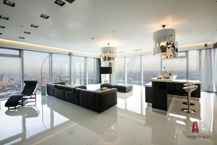 Определяющим в декоративном наполнении квартиры стала потрясающая московская перспектива, открывающаяся из панорамных окон небоскреба.